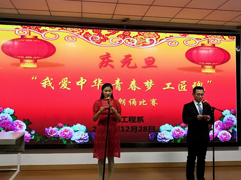 为了弘扬祖国传统文化,激发学生爱国热情,重温经典诗歌,感受中国传统文化博大精深,提升学生文化素养,展现时代气息,培养工匠精神,2019年12月28日晚我系在第一阶梯教室举办了“我爱中华青春梦工匠魂”为主题的庆元旦诗歌朗诵比赛。