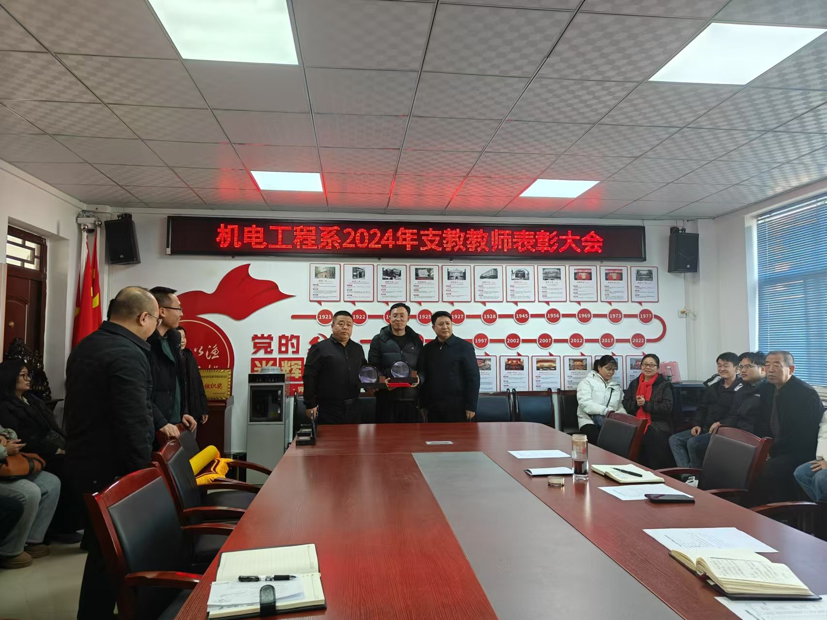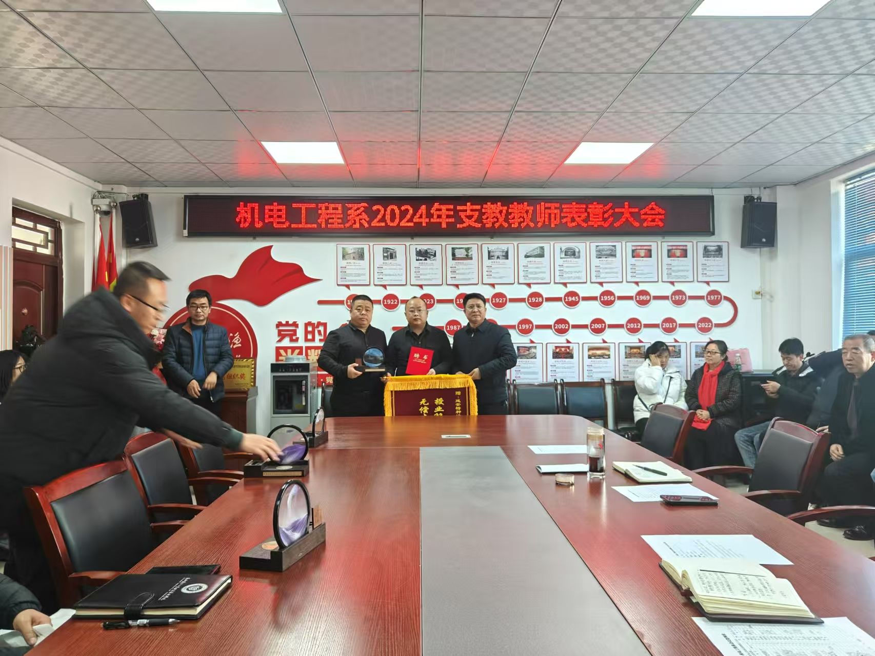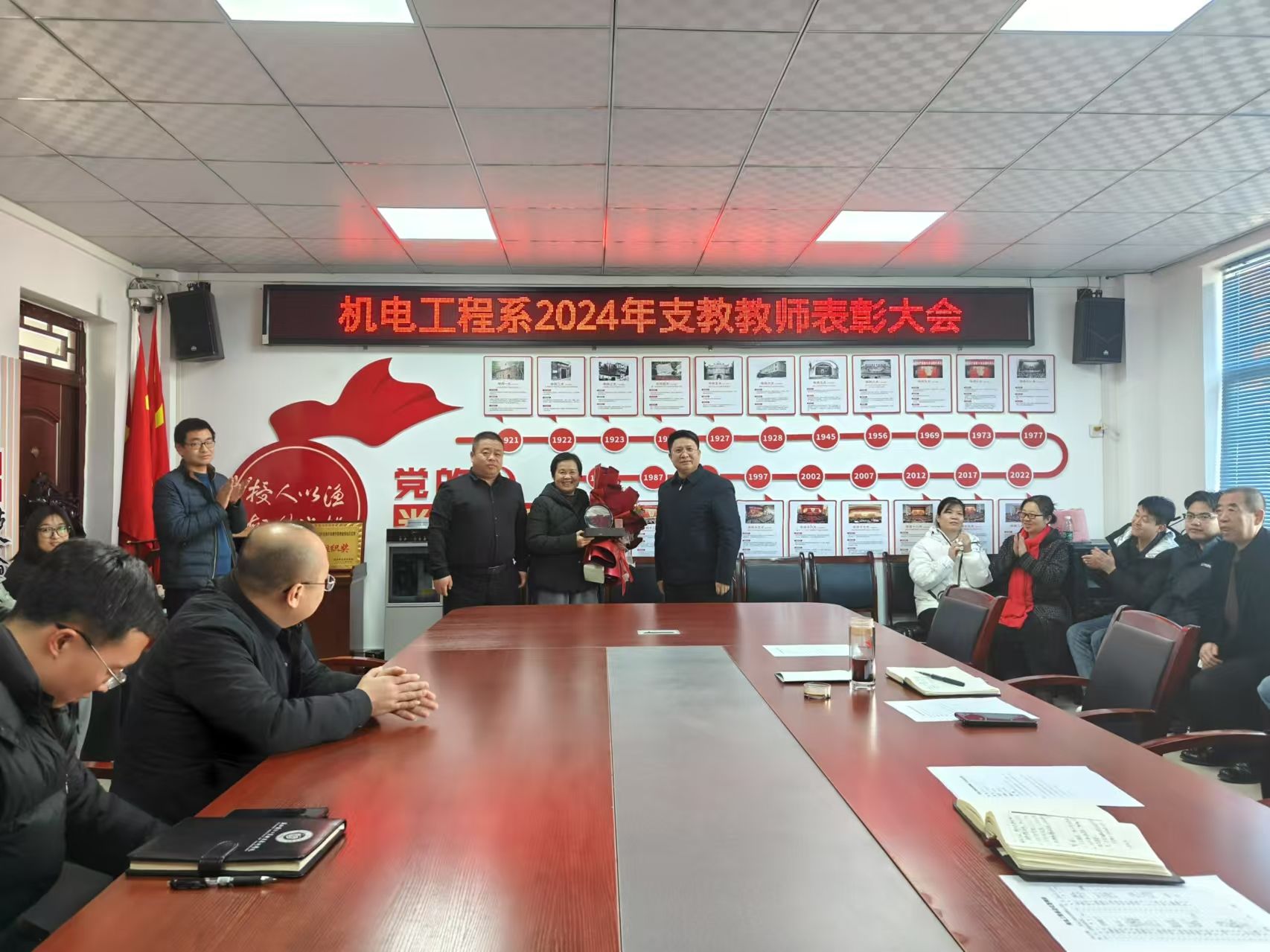 系主任李雄伟和系党总支书记薛雷先后向陕国防支教教师颁发荣誉证书并赠送纪念品,向义务支教路飞飞同志赠送锦旗和纪念品,向退休教师薛彩虹同志赠送鲜花和纪念品。