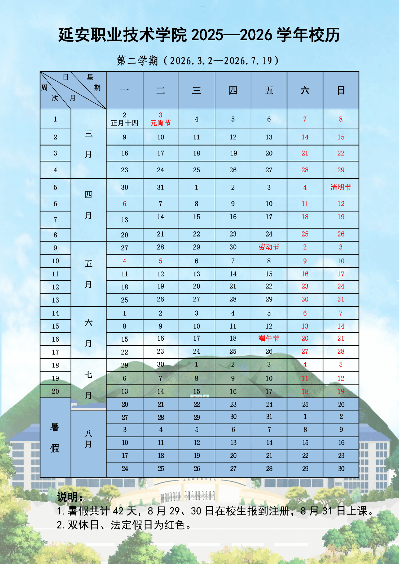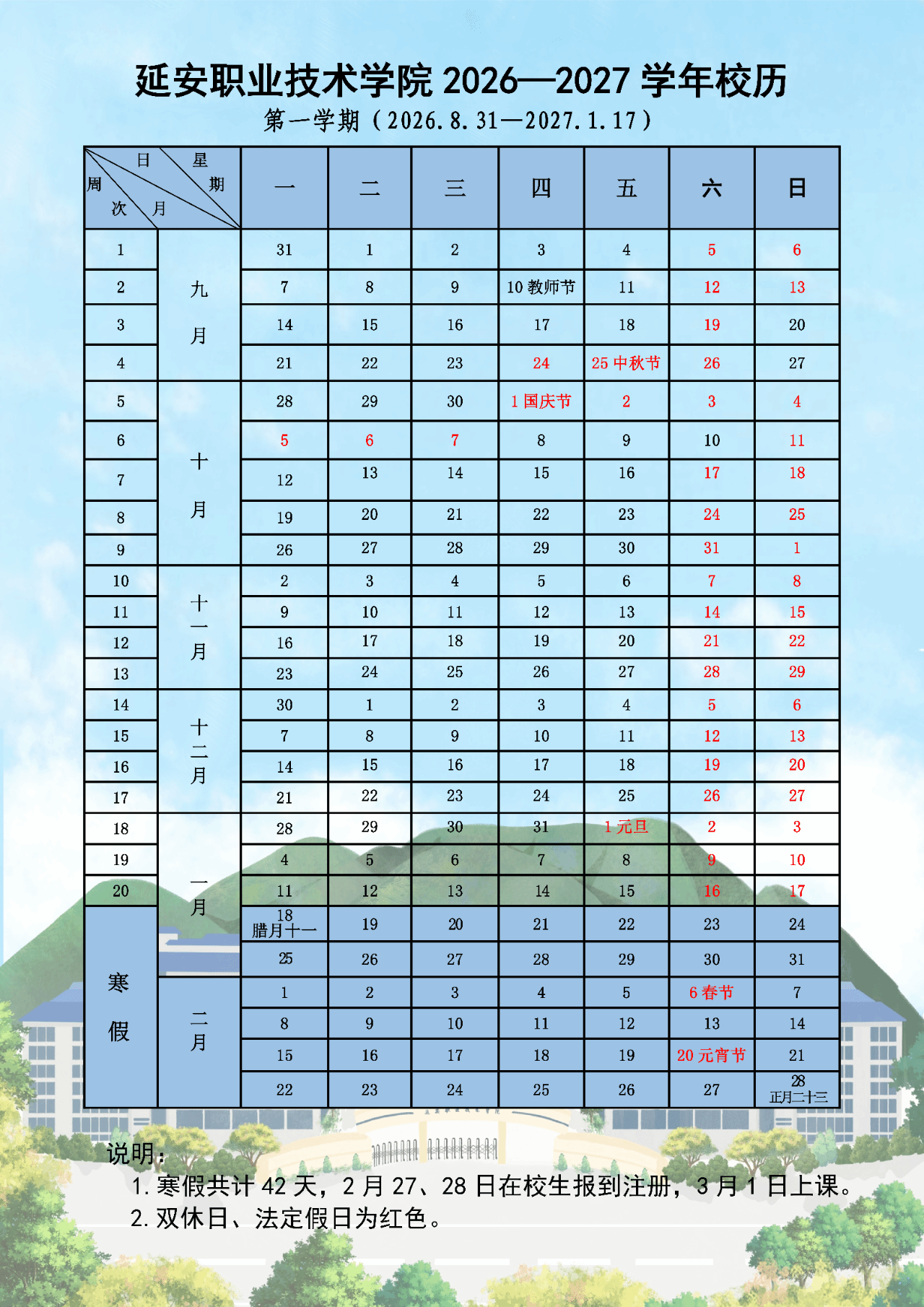 延安职业技术学院新学期校历发布!