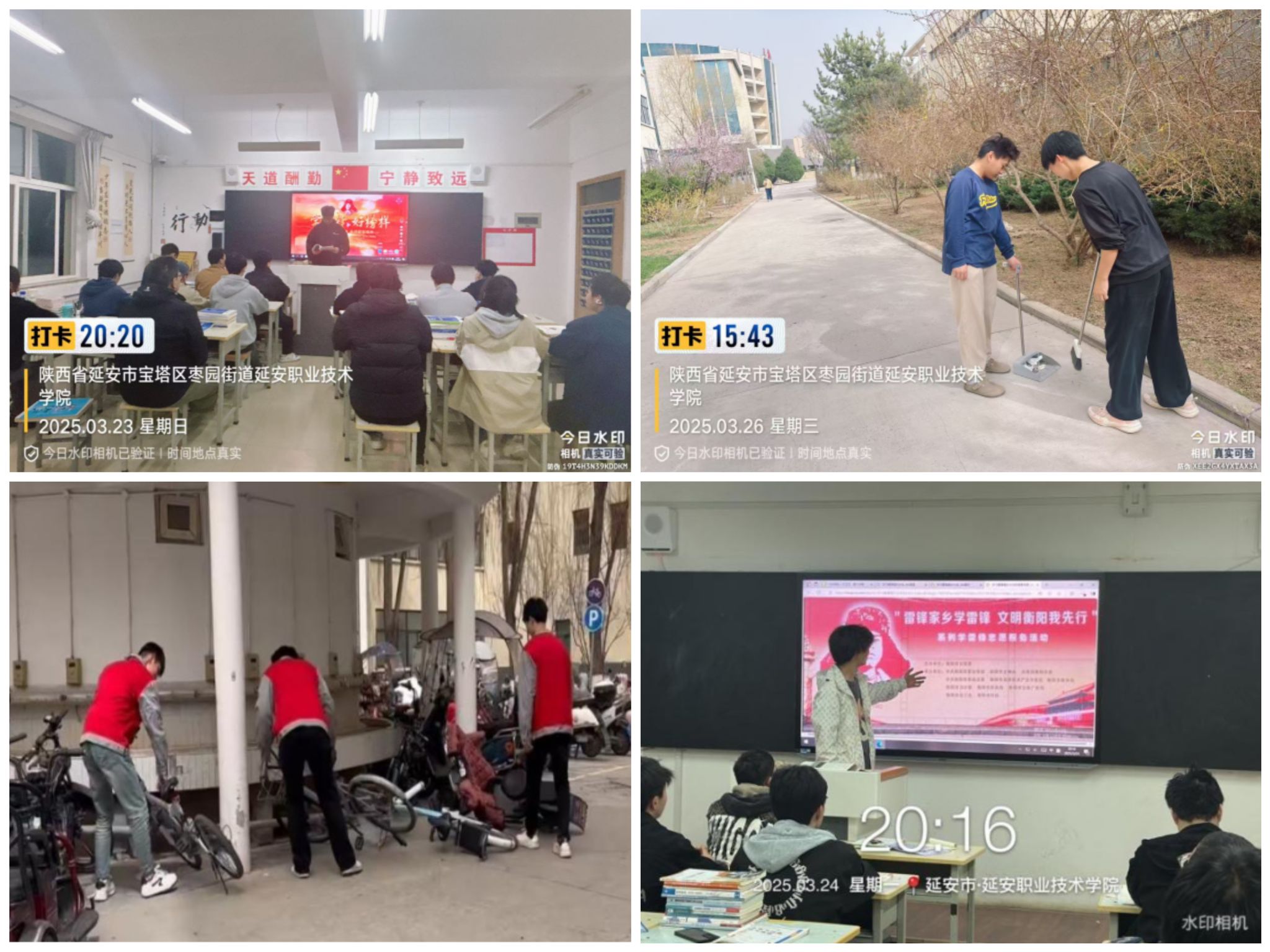 活动期间,各班级踊跃参与。2022级汽检(五)1班、2023级汽检(五)1班、24级汽检(五)1班联合开展“学雷锋・见行动——清洁家园公益行”活动。同学们在校园周边清理街道、绿化带、擦拭公共设施,并前往枣园革命旧址参观学习。将学习雷锋精神和传承红色基因相结合,激励青年学子勇担时代使命,为社会的发展贡献出自己的青春力量。