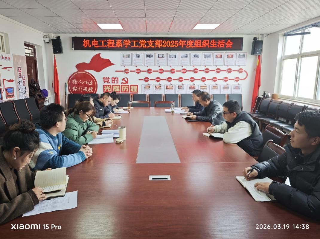 为深入学习贯彻习近平新时代中国特色社会主义思想与党的二十届四中全会精神,锲而不舍落实中央八项规定精神,推进作风建设常态化长效化,牢固树立和践行正确政绩观,根据学院党委统一部署,机电工程系学工党支部于3月19日在12号楼B402会议室召开2025年度组织生活会并同步开展民主评议党员工作。支部全体党员参加会议,会议由党支部书记马松杰主持。