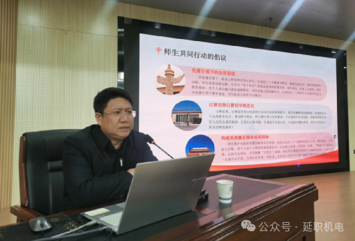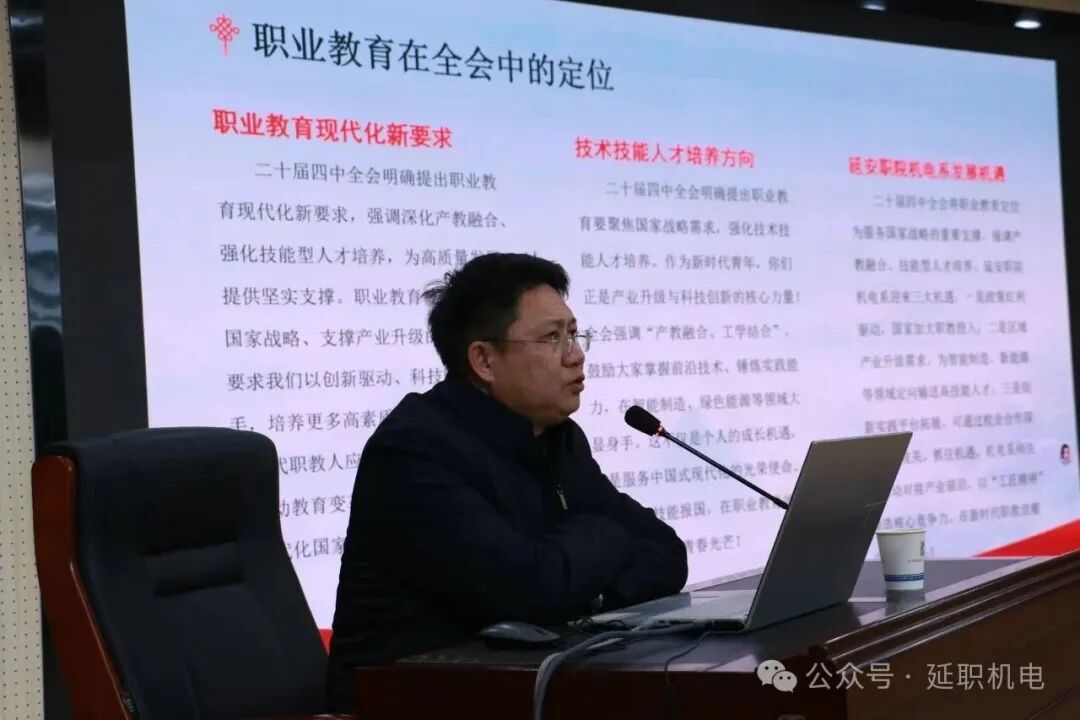 李雄伟围绕党的二十届四中全会精神解读、新时代职业教育使命与担当等五大板块系统阐述。他指出,党的二十届四中全会是全面建设社会主义现代化国家关键时期的重要会议,聚焦教育、科技、人才核心议题,明确了职业教育服务国家战略、支撑产业升级的定位,为机电工程系高质量发展指明方向。结合全会“深化产教融合、强化技能型人才培养”要求,他分析了系部政策红利、产业需求、平台拓展三大机遇,鼓励师生对接智能制造、新能源等前沿领域,在服务国家战略中找准定位、主动作为。