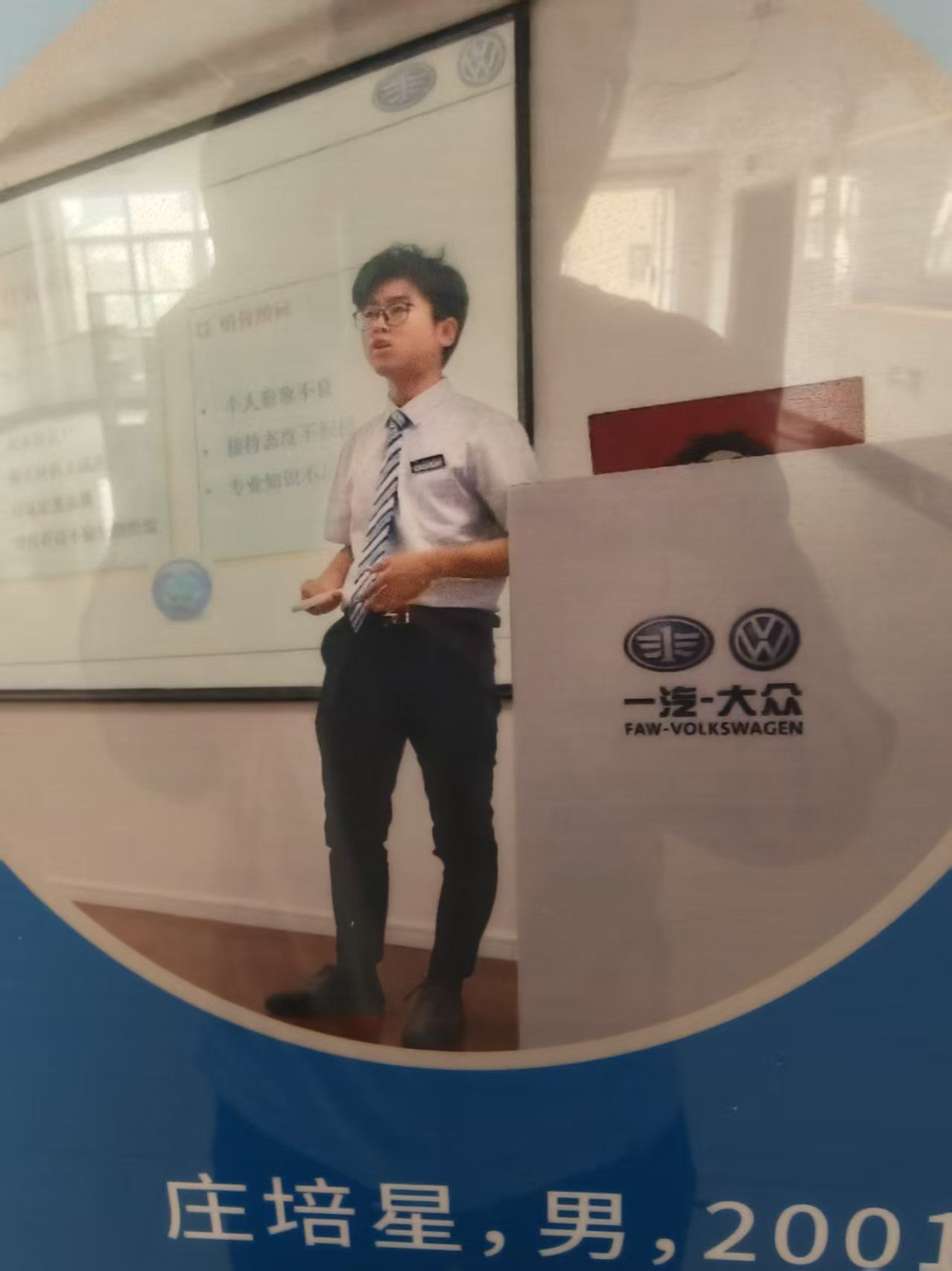 庄培星,男,汉族,陕西省榆林市榆阳区人,延安职业技术学院机电工程系2020届汽车检测与维修技术专业毕业生。毕业后就职于榆林恒源4S店,担任销售顾问一职。现任销售经理,月薪10000元。
