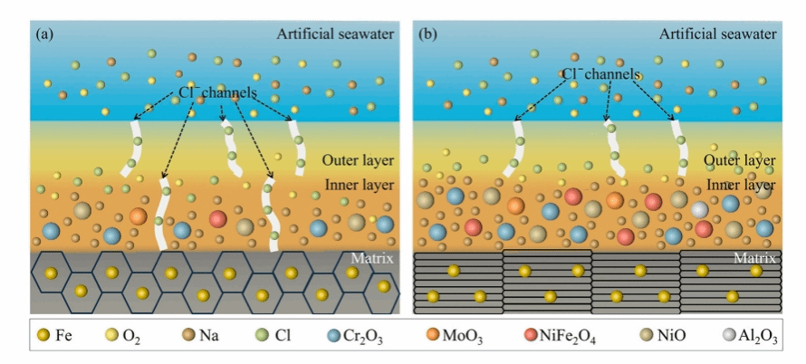 一直以来,传统马氏体-奥氏体双相钢(MADP)虽能在一定程度上实现高强度与高延展性的协同,然而其多相界面容易形成微电池效应,导致耐腐蚀性较差,这一缺陷严重限制了其在工业领域的广泛应用。而此次研究团队另辟蹊径,提出了一种创新的 “表面电负性氧化物与内部多界面协同保护” 策略,成功开发出纳米层双相钢(NL - MADP 钢)。这种新型钢材兼具超高强度、优异延展性和卓越耐腐蚀性,为海洋装备、桥梁等在严苛环境下工作的工程材料设计提供了全新的思路。