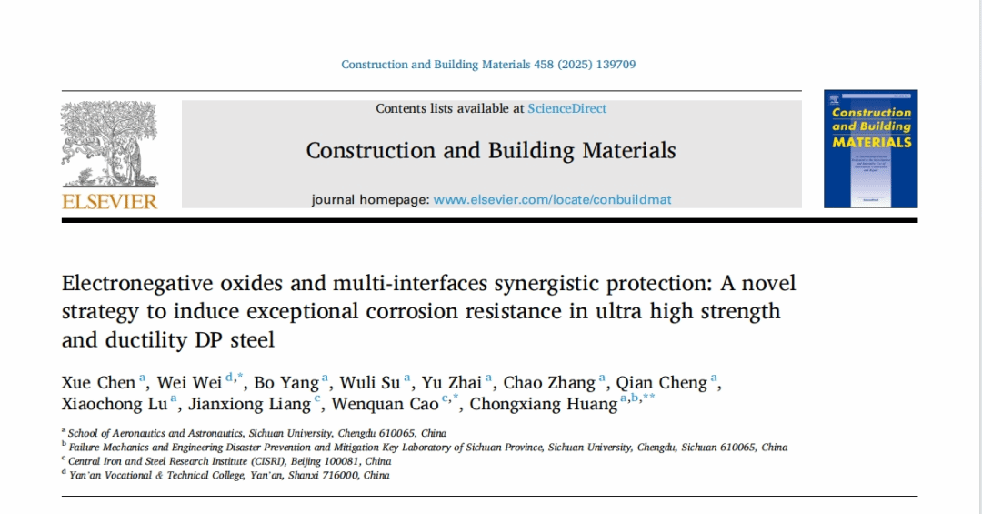 近日,我院魏维博士与四川大学黄崇湘教授团队、中国钢铁研究总院曹文全研究员团队,一同在国际权威期刊《Construction and Building Materials》(影响因子:7.4,中科院分区1区,top期刊)发表题为《Electronegative oxides and multi-interfaces synergistic protection: A novel strategy to induce exceptional corrosion resistance in ultra high strength and ductility DP steel》的研究论文,魏维博士以共同通讯作者身份参与该工作。